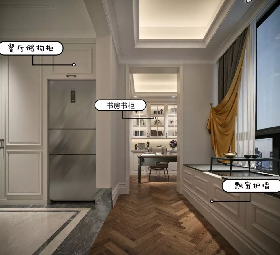 位于玄关的多媒体柜,是整个家的收纳领导者。电源箱、路由器、乱遭遭的线路……它能藏住你想遮起来的一切。内嵌式冰箱不仅解放了厨房的压力,也节约了占地空间。
